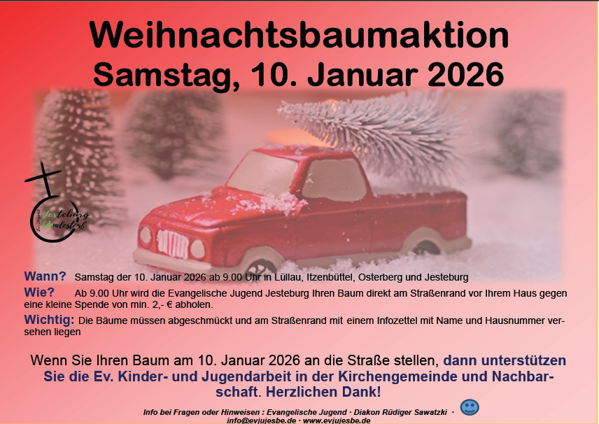 Die Weihnachtsbaumaktion veranstalten wir jedes Jahr im Januar nach den Heiligen Drei Königen (06.01.). Bei der Aktion sammeln wir die Weihnachtsbäume der Ortsteile der Gemeinde Jesteburg (Lüllau, Osterberg, Itzenbüttel, Jesteburg) ein und erhalten dafür Spenden. Gebeten wird dabei um eine Spende von mindestens 2 Euro. Mit dem Erlös werden Aktionen und Projekte der Ev. Jugend zum Teil mitfinanziert und ein Teil kommt der Evangelischen Jugend in der Nachbarschaft #evjujesbe zu Gute. Bei der Aktion unterstützen uns die örtlichen Landwirte, unsere Konfirmanden und viele Unterstützer aus unserer Evangelischen Jugend und Gemeinde.